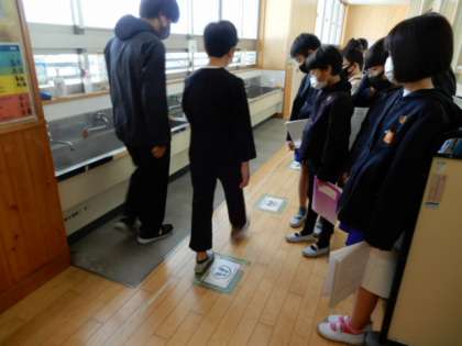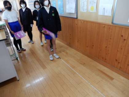 廊下に巻き尺を広げて、自分の歩幅を平均から求める活動です。