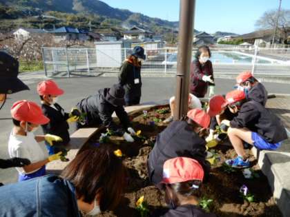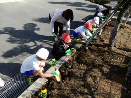 地域の方々にお越し頂き、パンジー植えを行いました。約400株のパンジーをみんなで植えました。