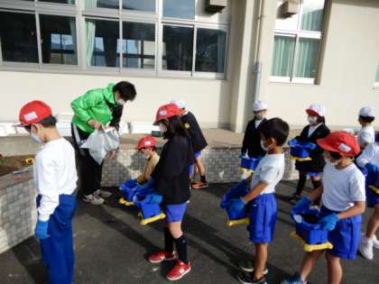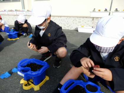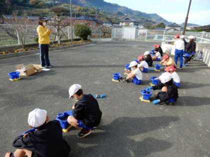 みんなでチューリップの球根を植えました。 先生のお話をしっかりときき、慎重に球根を植えることができました。これからお世話、がんばってね。