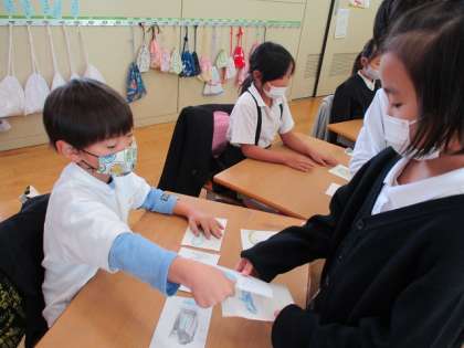 お店でうっているものの種類やものの名前をカードに書いて、お店屋さんごっこをしました。