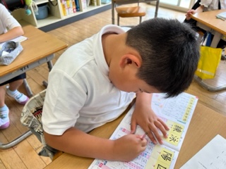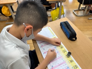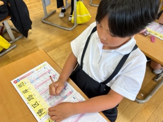 書き順を確かめたあとは、その漢字を使った言葉を考え、発表し合います。