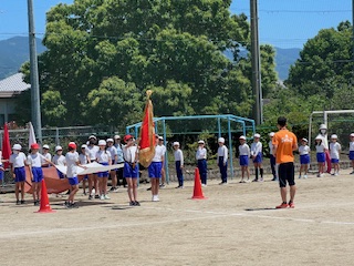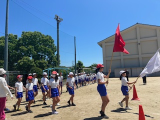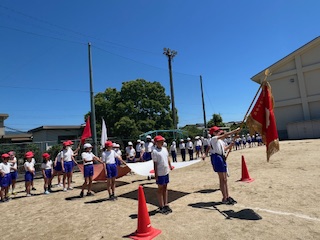 重い校旗ですが、児童長がしっかり持ってかっこよく入場しています。
