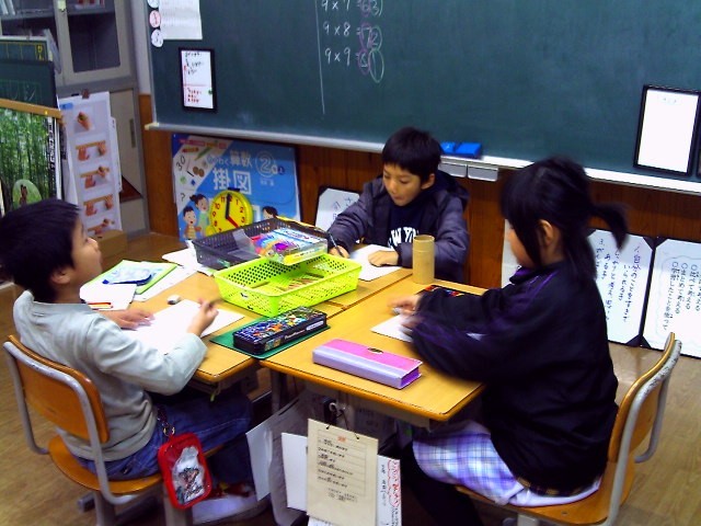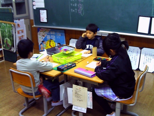 図工の時間、色をぬる際に、色鉛筆やマジックを持って、「これ、ここにおくで。」「とりやすいやろ。」と声をかけて使い始めました。それぞれ、色をぬりながら、「次、かして。」「分かった。」と使っています。「真ん中においたら、使いやすいなあ。」といい顔で話していました。こうして自然と話したり、聞いたりすることができていて、すてきでした。