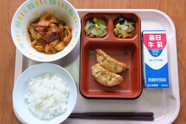 酢豚も揚げ餃子もご飯によくあいます。野菜もたっぷりです。苦手な食べ物も、練習して食べられるようになってください。