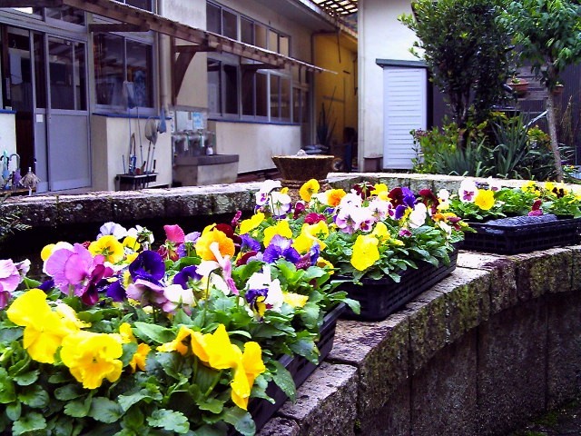 今朝の気温は、9℃。曇り空です。山に霧がかかっています。寒さが少しゆるみ、曇り空ですが、花たちはしっかりと花びらを広げています。