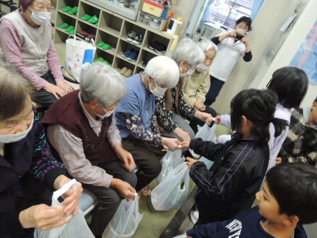 鉢植えを入れた袋を一人ずつ手渡し、お返しにと手作りのクリスマス飾りのついたお菓子をいただきました。