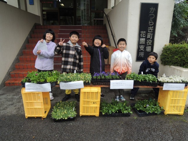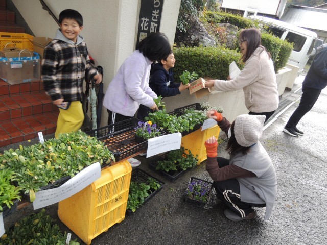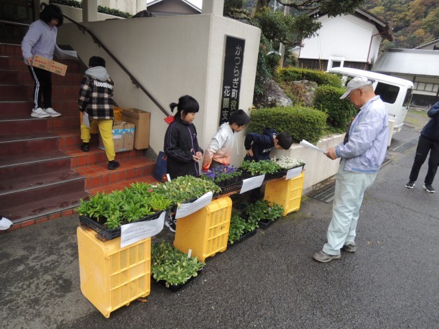 役場花園支所前で、花苗の配付をしました。さながら花屋さんです。