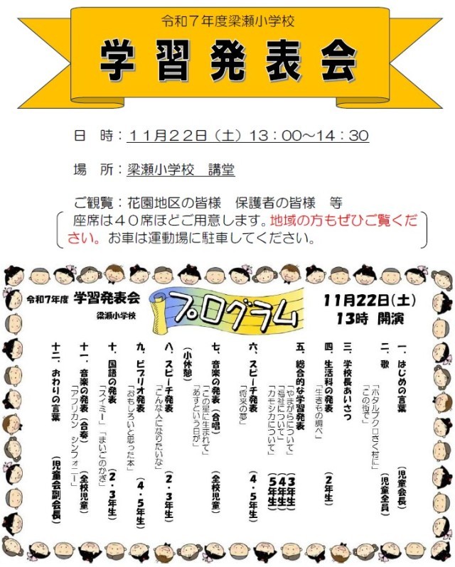 あすは学習発表会です 公開日 2025/11/21 更新日 2025/11/21 学級から 子どもたちは、たくさん練習した成果を見ていただこうと、とても張り切っています。たくさんのご来校をお待ちしています。