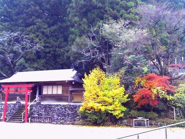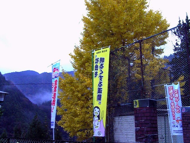 朝霧が出ています。イチョウ、もみじの紅葉が美しい朝です。