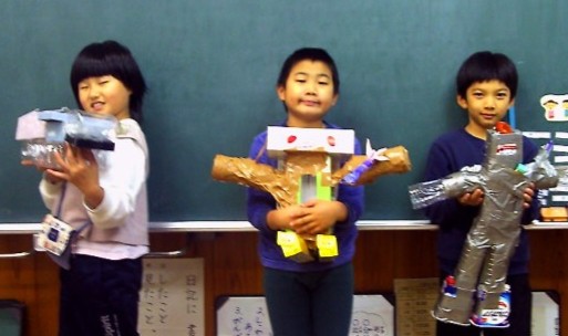 身の回りの物を材料として、うまく組み合わせ工作しました。「作ってみたい!」と言っていたくらいで、3人とも、いきいきとどんどん作っていきます。「この子は、お兄ちゃんな。」と物語を話し始めたり、「先生、見てください!これは、こんな風になるんですよ。」と話したり。作り終えてからも、改良をくり返しながら、休憩中遊んでいます。子どもたちの自由な、広がりのある創造力に感心しました。お気に入りの工作、出来上がりです!