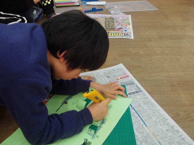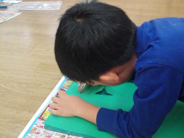 2年生は、手元に注意しながら慎重にカッターで窓枠に切り込みを入れる作業。