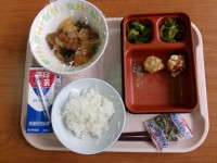 今日の献立は、「ご飯・牛乳・鶏肉の梅焼き・油揚げのごま酢和え・あさりの味噌汁・のり佃煮」です。