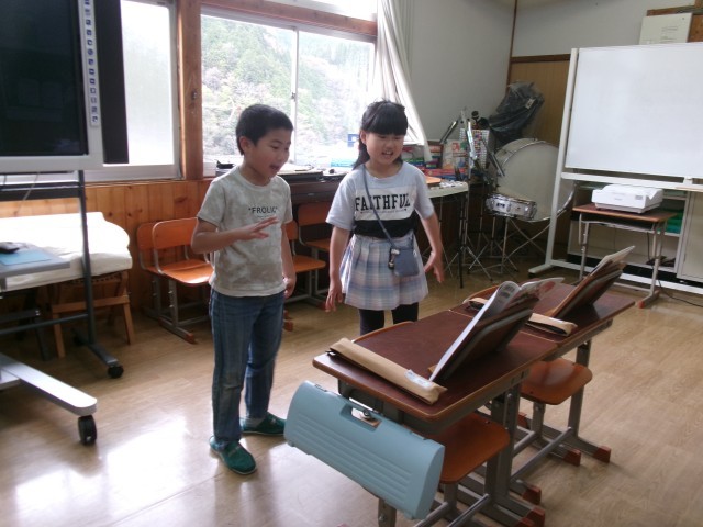 伴奏に合わせて、3年生の教材「ほしぞら」「にじ」を歌いました。