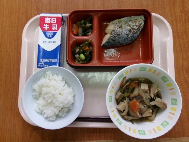 今日の献立は、「ご飯・牛乳・さわらの塩焼き・茎わかめ和え・鶏団子と高野豆腐の煮物」です。