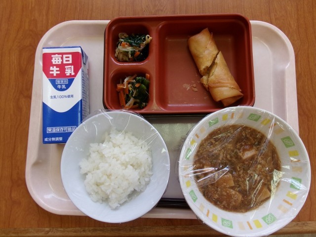 今日の献立は、「ご飯・牛乳・マーボー豆腐・三色ナムル・春巻き」です。