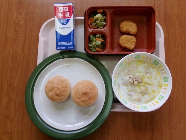 今日の献立は、「金芽米パン・牛乳・キャベツのクリーム煮・きゅうりとブロッコリーのサラダ・チキンナゲット」です。