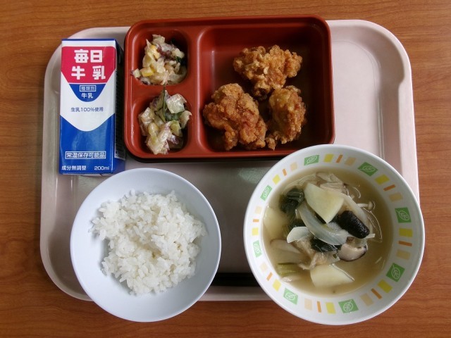 今日の献立は、「ご飯・牛乳・鶏のから揚げ・海藻サラダ・じゃがいもと玉ねぎの味噌汁」です。