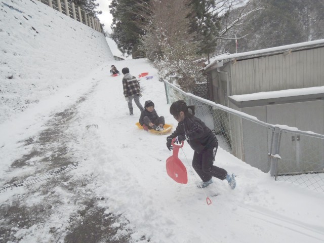 斜面にも雪が積もったのでみんなで遊びました。雪が固まってくるとスピードが少し上がって楽しさ倍増です。