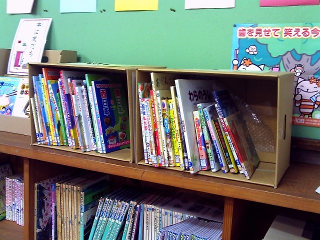 町図書館から、毎月本を50冊ほど持って来てくださいます。毎回、どんな本がくるのか楽しみにしています。本が届いたら、うれしそうに「この本読んでみたい。」と見に行っている子がいます。読むことが楽しそうです。