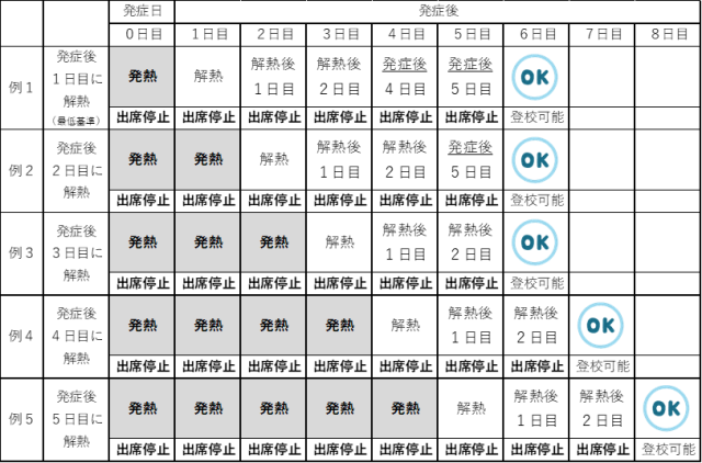 インフルエンザに罹患した場合、「発症した後5日を経過し、かつ、解熱した後2日を経過するまで」は出席停止となります(学校保健安全法施行規則第19条)。