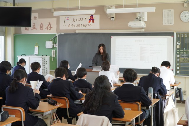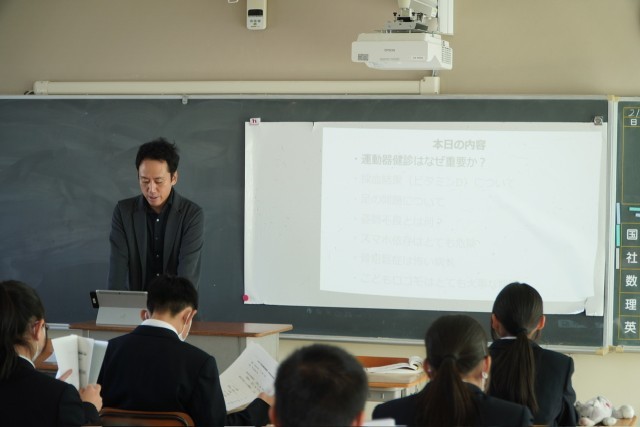 生徒一人一人に、健診の結果を元に、こどもロコモについてのお話やスマホ依存についてなどお話しいただきました。本校では3人に1人がスマホ依存の疑いがあるとの調査結果も。検診結果を元にご家庭でも確認いただき話すきっかけにしていただければと思います。