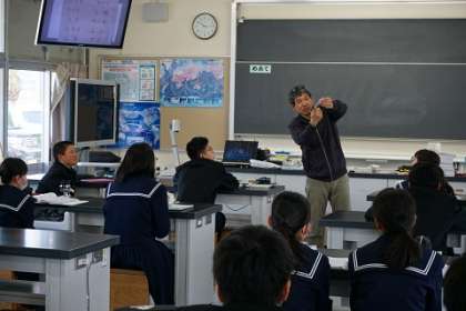2年生の理科の様子 教材提示装置からTV画面に大きく実験内容が提示されます。