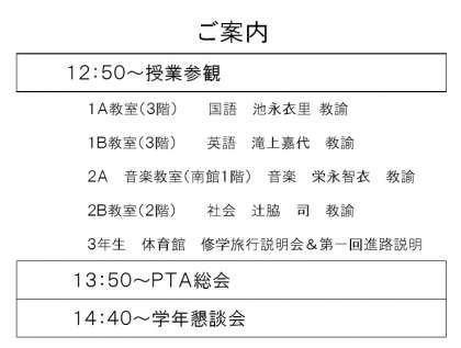 明日4/18(水)は授業参観日・PTA総会・学年懇談会です。たくさんのご参観をお待ち申し上げてます! 公開日 2018/04/17 更新日 2018/04/17 学校の様子 駐車場は南校舎南側からお詰めください。生徒がクラブ中です。事故にご留意ください。