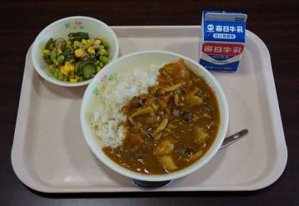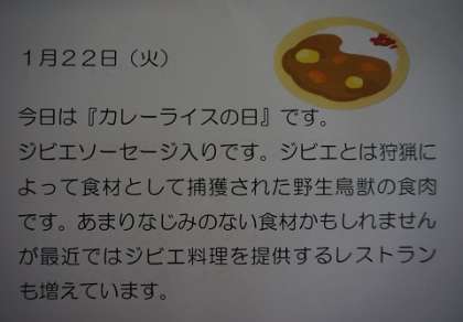1/22(火)今日の給食 公開日 2019/01/22 更新日 2019/01/22 給食 ◎玄米ごはん ◎カレー(ジビエ献立)ソーセージがジビエです ◎きゅうりのコロコロサラダ ◎牛乳 924kcal