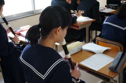 音階を見ながらリコーダーを演奏する練習