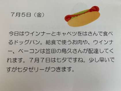 7/5(金)今日の給食 公開日 2019/07/05 更新日 2019/07/05 給食 〇セルフサンド (コッペパン・ウインナーソーセージ2本・キャベツ・ケチャップ) 〇具だくさんコンソメスープ (ベーコン・しめじ・じゃがいも・たまねぎ・にんじん) 〇七夕デザート 〇牛乳 797kcal
