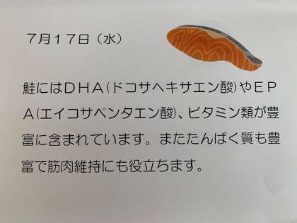 7/17(水)今日の給食 公開日 2019/07/17 更新日 2019/07/17 給食 〇ごはん 〇鮭の韓国風照焼き 〇きんぴらごぼう (ごぼう・豚もも肉・にんじん・こんにゃく) 〇ひじきの酢のもの (乾燥ひじき・小松菜・ロースハム・枝豆) 〇牛乳 753kcal