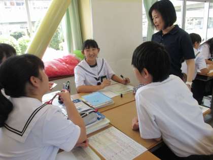 今日は「長方形の厚紙から51㎤の容器を作ろう」という課題でグループ学習に取組みました。グループ学習の際には「対話的な活動での言語活動における目指すべき段階」というシートを活用し、今日は「役割を理解し、協力しながら時間内に課題を終える」を目指して画用紙から容器を作る活動をしました。