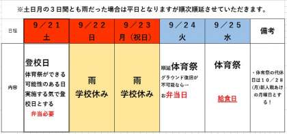 ご心配をおかけしております。台風17号と秋雨前線次第という悩ましい状況です。上表は順延予定です。9/21(土曜日)は登校日とさせてください。