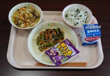 9/19(木)今日の給食 公開日 2019/09/19 更新日 2019/09/19 給食 ◎わかめごはん ◎かやくうどん ・うどん、豚もも肉、葉ネギ、人参、わかめ、玉葱、うす揚げ、蒲鉾、椎茸 ◎小松菜とじゃこの和え物 ◎紫いもチップス1袋 ◎牛乳 741kcal