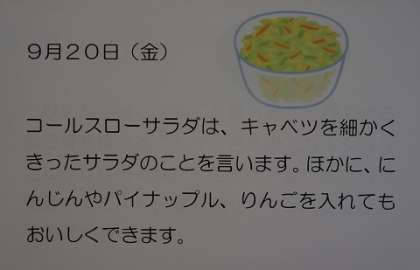 9/20(金)今日の給食 公開日 2019/09/20 更新日 2019/09/20 給食 ◎コッペパン ◎鶏肉のバーベキューソース ◎コールスローサラダ ◎具だくさんコンソメスープ ◎牛乳 809kcal