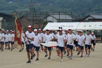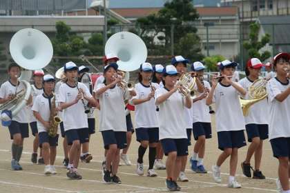 県吹奏楽コンクール3年連続金賞、本校吹奏楽部が先導しての入場です。