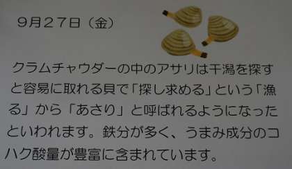 9/27(金)今日の給食 公開日 2019/09/27 更新日 2019/09/30 給食 ◎コッペパン ◎オムレツ(ケチャップ1袋) ◎クラムチャウダー ・あさり、豚ベーコン、じゃがいも、玉葱、人参、しめじ、マッシュルーム、コーン ◎胡瓜と枝豆のツナサラダ ◎牛乳 812kcal
