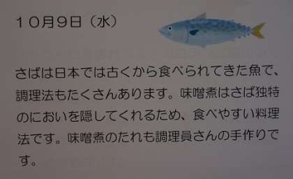 10/9(水)今日の給食 公開日 2019/10/09 更新日 2019/10/09 給食 ◎ごはん ◎サバの味噌煮 ◎ひじきの酢の物 ・ひじき 小松菜 ロースハム 枝豆 ◎すまし汁 ・木綿豆腐 ほうれん草 ワカメ 葉ねぎ ◎牛乳 736kcal