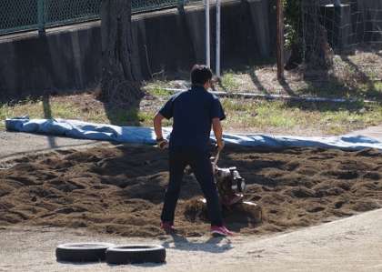 スポーツの秋、体育の授業は陸上競技に入っています。幅跳び練習のために砂場を耕し準備をしています。