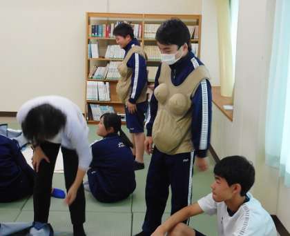 生命の誕生は神秘です。命につながる性の話しを保健師さんが丁寧に講義してくれました。写真下は妊婦体験の様子です。