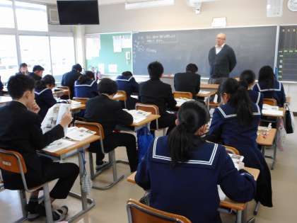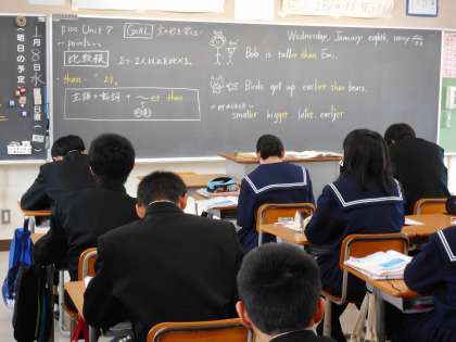 2Aは英語で比較級の文の作り方を、2Bは社会でフランス革命がなぜ起こったのかを考える授業です。