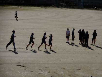 2年生は体育、1000m走のタイムをとっています。すでに終わった生徒は走っている生徒に「ガンバレ」と何度も声をかけていました。