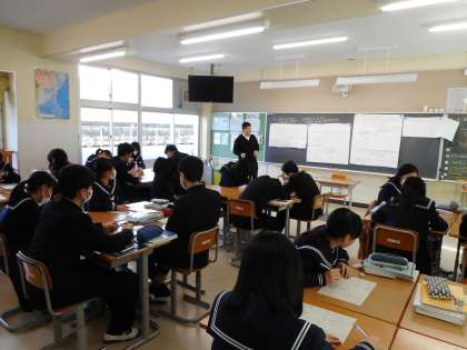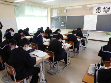 3Aは国語、「奥の細道」を辞書を片手に現代語訳しています。