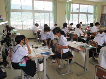 本日の4限は1Aが国語で、「ダイコンは大きな根?」の学習が一通り終わったところでまとめプリントをしています。1Bは社会で、「世界の工場って何だろう?」という先生の投げかけにペアで話をしているところです。