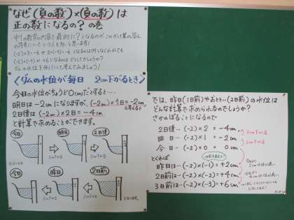 階段には「なぜ(負の数)×(負の数)は(正の数)?」の掲示物があります。皆さんはもう読みましたか?