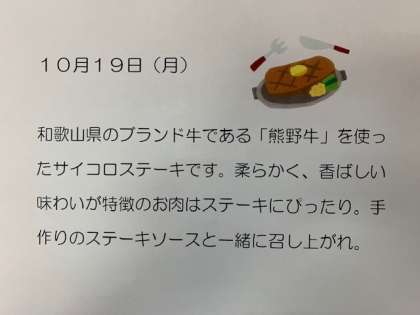 10/19(月)今日の給食 公開日 2020/10/19 更新日 2020/10/19 給食 ・ご飯 ・サイコロステーキ 4切れ(加熱の都合でカットステーキ状になりました) ・ボイル野菜 ・味噌汁 ・牛乳 849kcal