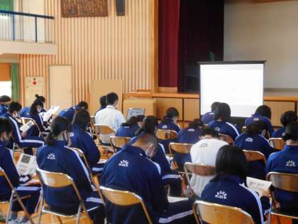 1年生の防災学習が始まりました。 かつらぎ町役場 危機管理課 奈良垣様に防災について講義していただいています。