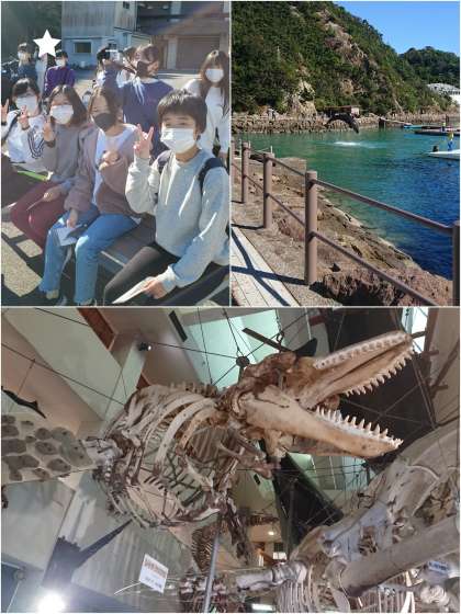 3年生 太地町立くじらの博物館です! 公開日 2020/11/10 更新日 2020/11/10 修学旅行 到着した時、ちょうどくじらのショーをやっていたので早速見学しました。くじらの骨格標本など、普段は見られないものがたくさんあり、興味津々です!