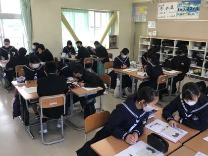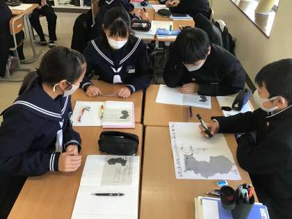 比例の利用として、和歌山県の面積を求めるためにはどうすればよいか、グループで協力して考えました。難しい課題でしたが一生懸命取り組んでいました。