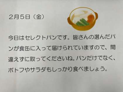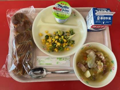 2/5(金)今日の給食 公開日 2021/02/05 更新日 2021/02/05 給食 ・セレクトパン (ねじチョコパン、パピロパン、パインパン) ・ポトフ ・ブロッコリーとコーンのサラダ ・ファイバーヨーグルト 1個 ・牛乳 858kcal
